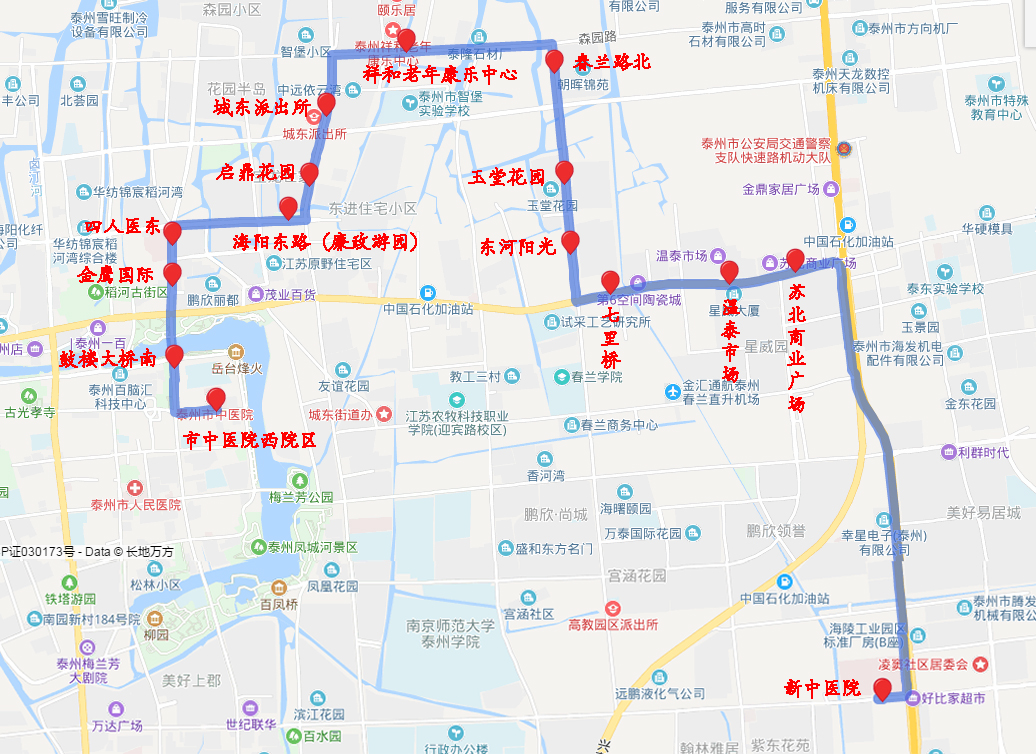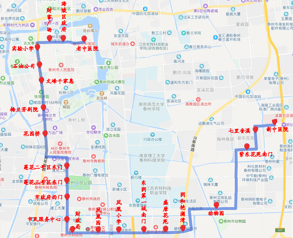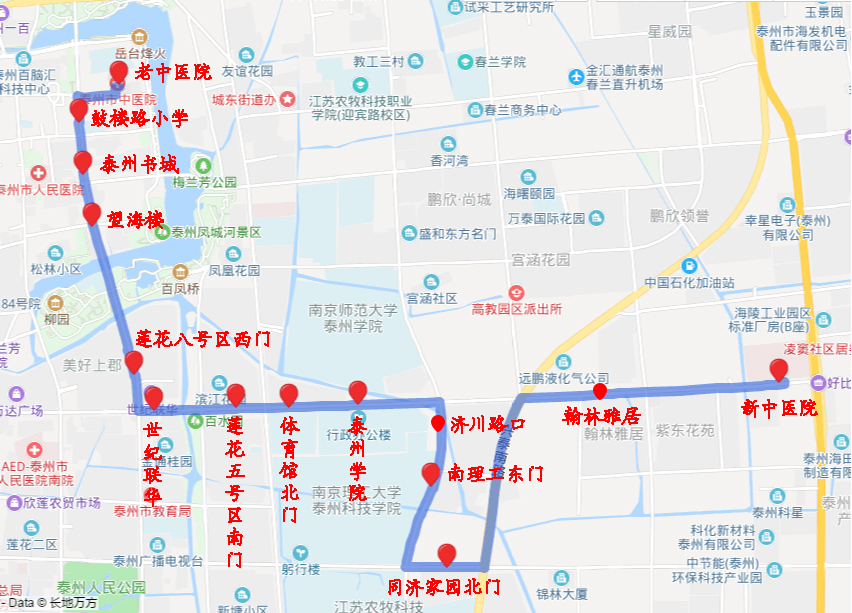 泰州市中醫(yī)院邑廟街院區(qū)-鼓樓路小學(xué)-泰州書(shū)城-望海樓-蓮花八號(hào)區(qū)西門(mén)-世紀(jì)聯(lián)華-蓮花五號(hào)區(qū)南門(mén)-體育館北門(mén)-泰州學(xué)院-濟(jì)川路口-南理工東門(mén)-同濟(jì)家園北門(mén)-翰林雅居-泰州市中醫(yī)院濟(jì)川路院區(qū)