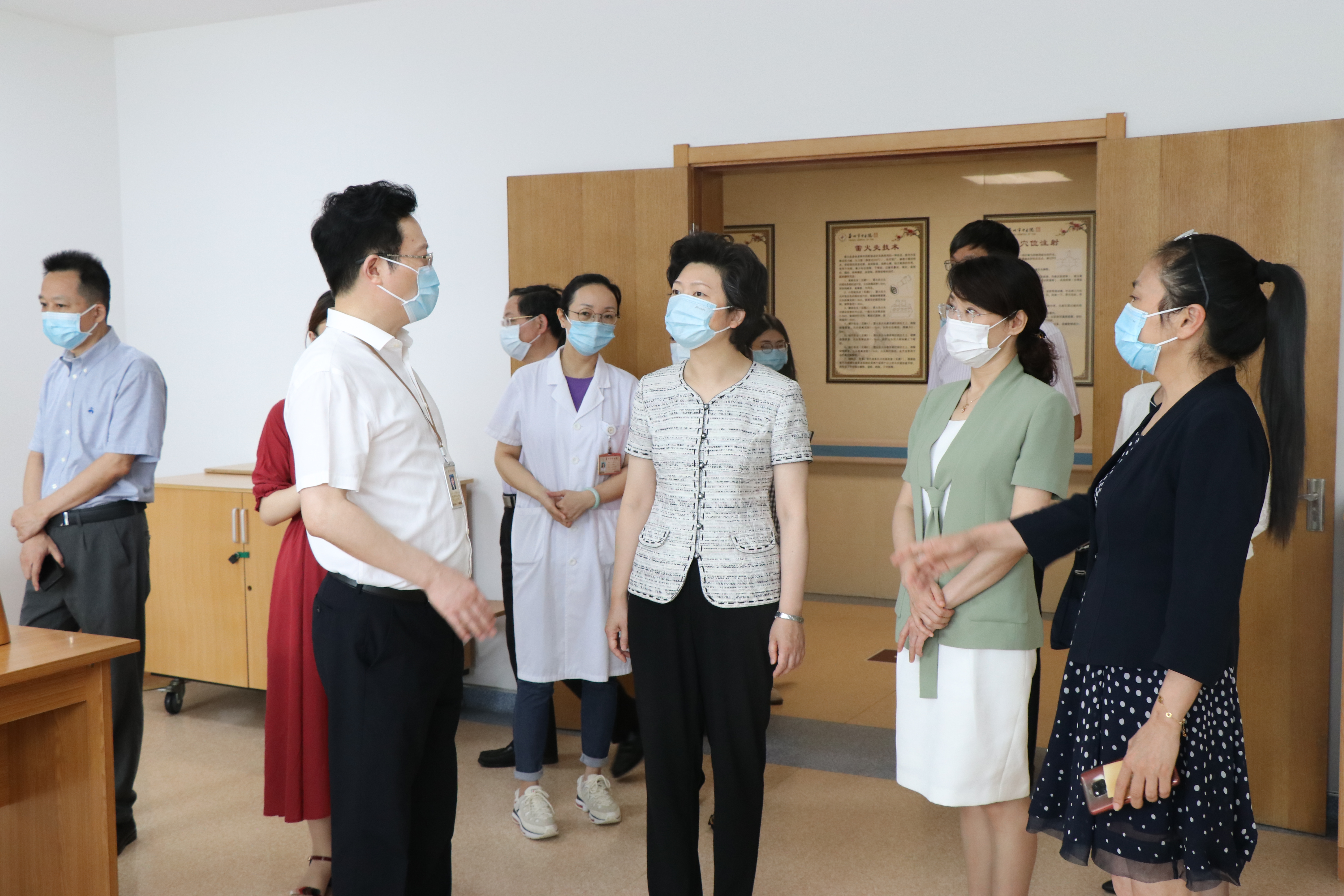 泰州市中醫(yī)院黨委書(shū)記、院長(zhǎng)王華及院領(lǐng)導(dǎo)班子成員陪同譚穎主任一行實(shí)地察看了我院門(mén)診大廳、中醫(yī)藥文化園、傳統(tǒng)療法中心、中醫(yī)經(jīng)典科、康復(fù)科、住院部等部門(mén),詳細(xì)了解我院的中醫(yī)診療技術(shù)、人才隊(duì)伍建設(shè)、新冠疫情防控等情況。
