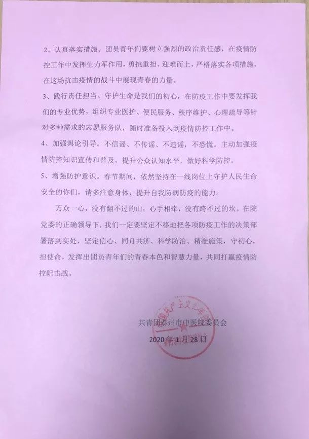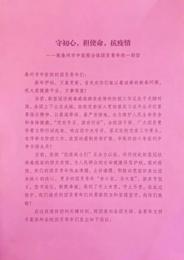 院團(tuán)委書記王威宣讀《致泰州市中醫(yī)院全體團(tuán)員青年的一封信》,他號(hào)召全院團(tuán)干部、廣大團(tuán)員青年立即行動(dòng)起來(lái),在院黨委的正確領(lǐng)導(dǎo)下,堅(jiān)定不移地把各項(xiàng)防疫工作的決策部署落到實(shí)處,守初心,擔(dān)使命,發(fā)揮出團(tuán)員青年們的青春本色和智慧力量,共同打贏疫情防控阻擊戰(zhàn)。
