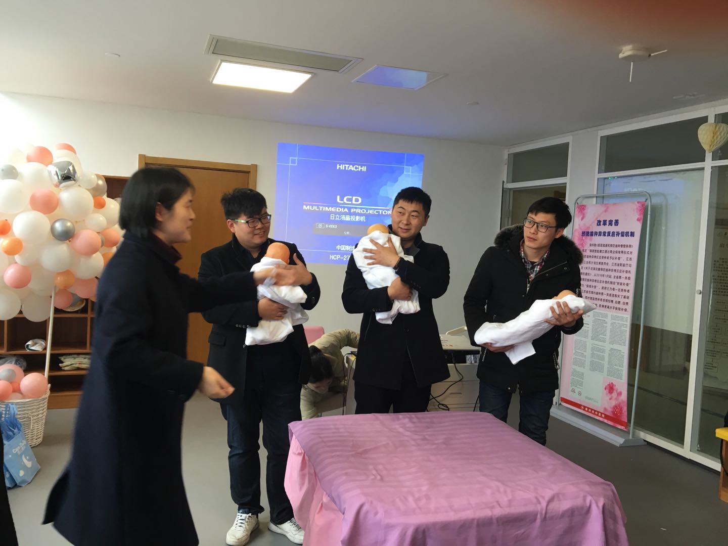 關(guān)愛婦幼,以“愛”為責(zé),最后一個(gè)環(huán)節(jié),由產(chǎn)房吳麗萍護(hù)士長帶動(dòng)大家參與沙龍活動(dòng),特別邀請(qǐng)?jiān)趫龅牧粶?zhǔn)寶爸們現(xiàn)場展示:如何環(huán)抱哭鬧的嬰兒?如何給嬰兒換尿不濕?從寶爸們笨拙的舉止和認(rèn)真的態(tài)度中,大家忍俊不禁的“哄堂大笑”,這不單單激發(fā)了寶爸們的父愛,同時(shí)喚醒了男神們對(duì)我們女神寶媽們的敬畏之情,有愛有責(zé)才有家。