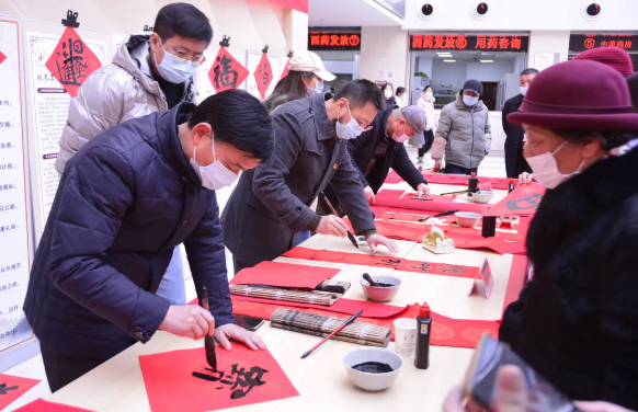 翰墨飄香,春意濃濃。活動現(xiàn)場氣氛和諧溫馨,書法家們激情飽滿地?fù)]毫潑墨,創(chuàng)作出各具特色的精美春聯(lián)和大“?!弊?,表達(dá)了對抗疫一線醫(yī)護(hù)人員和廣大群眾濃濃的祝福?!案P歉哒杖腋#镁俺ER康樂家”,“春歸大地人間暖,福降神州喜臨門”……一行行俊逸的書法,字里行間都是質(zhì)樸真誠的新春祝愿。在渲染出濃濃年味的同時,也寄托大家辭舊迎新、接福納祥的美好愿望。我院職工也表現(xiàn)出極大的熱情,志愿人員積極協(xié)助書法家們鋪紙注墨、整理對聯(lián)。不多時,一幅幅火紅吉祥的春聯(lián),一行行剛勁有力的書法,展示在大家面前。前來領(lǐng)取春聯(lián)的群眾絡(luò)繹不絕,爭相選擇自己喜歡的春聯(lián),紅紅的春聯(lián)、濃濃的祝福、開心的笑聲融合在一起,繪成了一幅幅感人的“年畫”。
