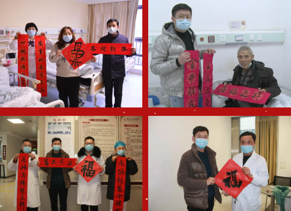 此次活動中,各位書法家還深入到門診診室、病房,給抗疫人員代表、坐診專家及在院患者送“?!?。在向我院援寧核酸檢驗隊員蔣瑩送上新春對聯(lián)時,美術(shù)學(xué)院黨總支副書記于晶晶激動地說:“正因為有你們這樣敬佑生命的白衣戰(zhàn)士負(fù)重前行,才有咱們?nèi)欣习傩盏男腋I?。”患者李奶奶收到春?lián)后說:“醫(yī)務(wù)人員堅守崗位很辛苦,向每一位堅守在崗位的醫(yī)務(wù)人員致敬,在出院之前還能收到書法大家寫的春聯(lián)和‘?!郑娴暮荛_心,也祝愿更多的患者早日康復(fù)?!?/p>