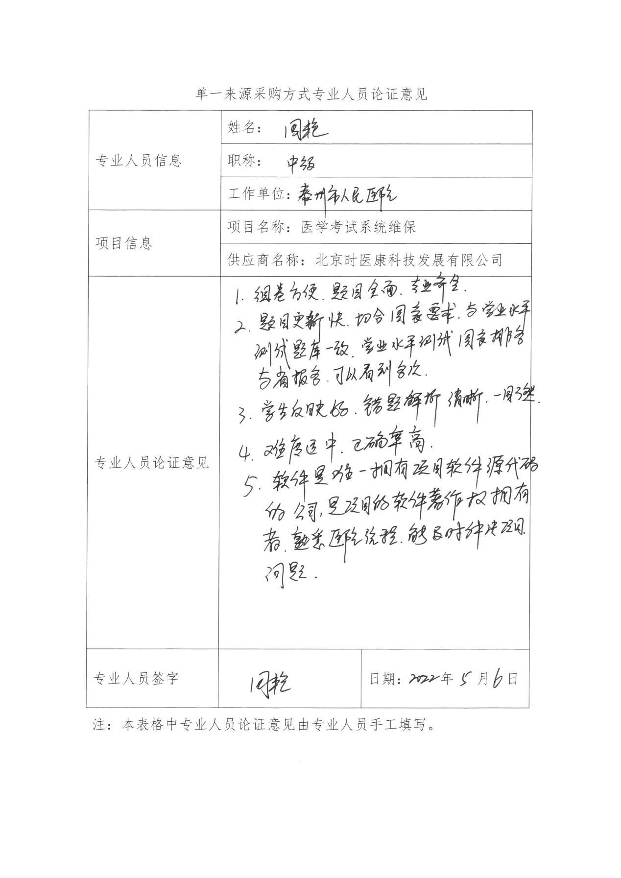 采用單一來源采購方式的原因及說明: 本院醫(yī)學(xué)考試系統(tǒng)為2019年建設(shè),2022年到期,作為醫(yī)師、護理三基考試主要工具,其具有專業(yè)性強、流程復(fù)雜、技術(shù)難點多的特點,需要專業(yè)維護團隊進行項目日常運轉(zhuǎn)的保障工作。北京時醫(yī)康科技發(fā)展有限公司作為項目建設(shè)方,是唯一擁有項目軟件源代碼的公司,是項目的軟件著作權(quán)擁有者,熟悉本院的醫(yī)學(xué)考試系統(tǒng)的流程,能及時解決項目問題,具備維護和保障本院醫(yī)學(xué)考試系統(tǒng)運行的能力?;谝陨锨闆r,為保障項目的穩(wěn)定運行,故采用單一來源采購形式。預(yù)計簽訂三年合同,預(yù)算金額6萬元。
