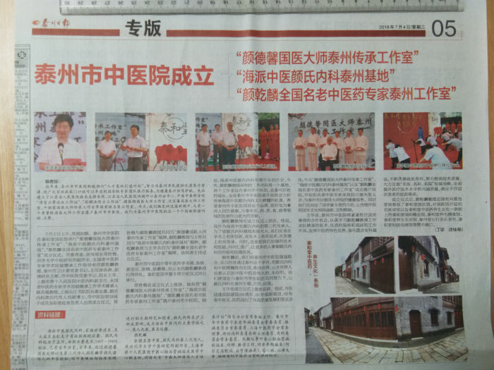 2018.7.4泰州日?qǐng)?bào):泰州市中醫(yī)院成立“顏德馨國(guó)醫(yī)大師泰州傳承工作室” “海派中醫(yī)顏氏內(nèi)科泰州基地” “顏乾麟全國(guó)名老中醫(yī)藥專家泰州工作室”