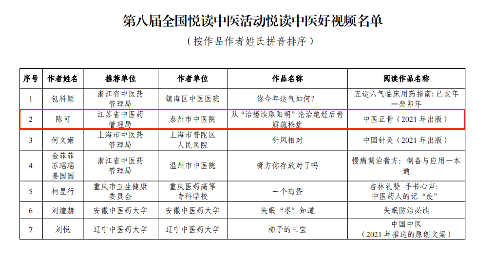 由中國中醫(yī)藥出版社、中國中醫(yī)科學(xué)院、中華中醫(yī)藥學(xué)會、《中國中醫(yī)藥報》社等單位共同主辦的第八屆全國悅讀中醫(yī)活動結(jié)果揭曉。我院榮獲“第八屆全國悅讀中醫(yī)活動優(yōu)秀成員單位”稱號,我院視頻作品《從“治痿讀取陽明”論治絕經(jīng)后骨質(zhì)疏松癥》獲“第八屆全國悅讀中醫(yī)活動悅讀中醫(yī)好視頻”。