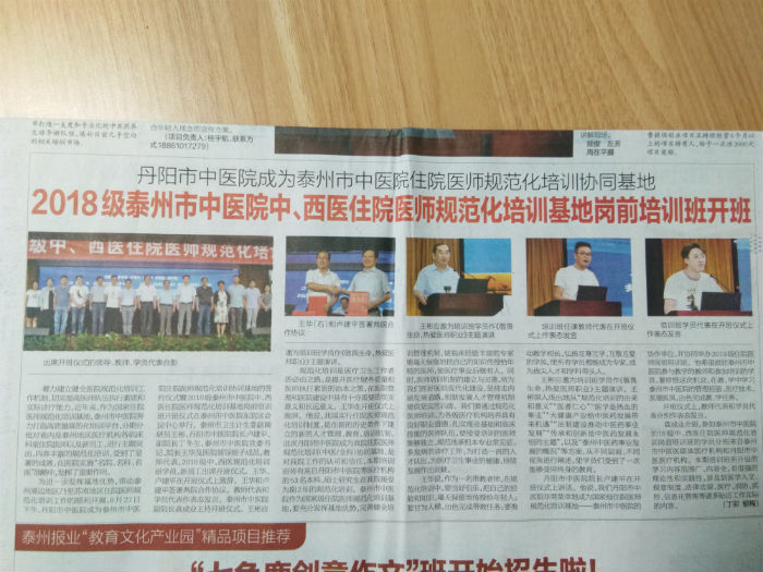 2018.8.29泰州日報:2018級泰州市中醫(yī)院中、西醫(yī)住院醫(yī)師規(guī)范化培訓基地崗前培訓班開班 丹陽市中醫(yī)院成為泰州市中醫(yī)院住院醫(yī)師規(guī)范化培訓協(xié)同基地