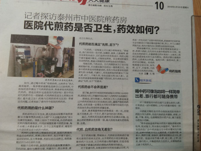 2018.6.30泰州晚報(bào):記者探訪泰州市中醫(yī)院煎藥房 醫(yī)院代煎藥是否衛(wèi)生,藥效如何?