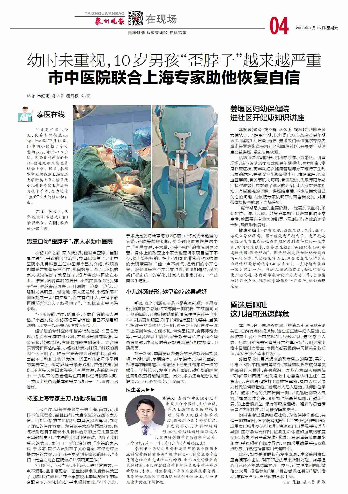 【泰州晚報(bào)7月15日】幼時(shí)未重視,10歲男孩“歪脖子”越來越嚴(yán)重市中醫(yī)院聯(lián)合上海專家助他恢復(fù)自信