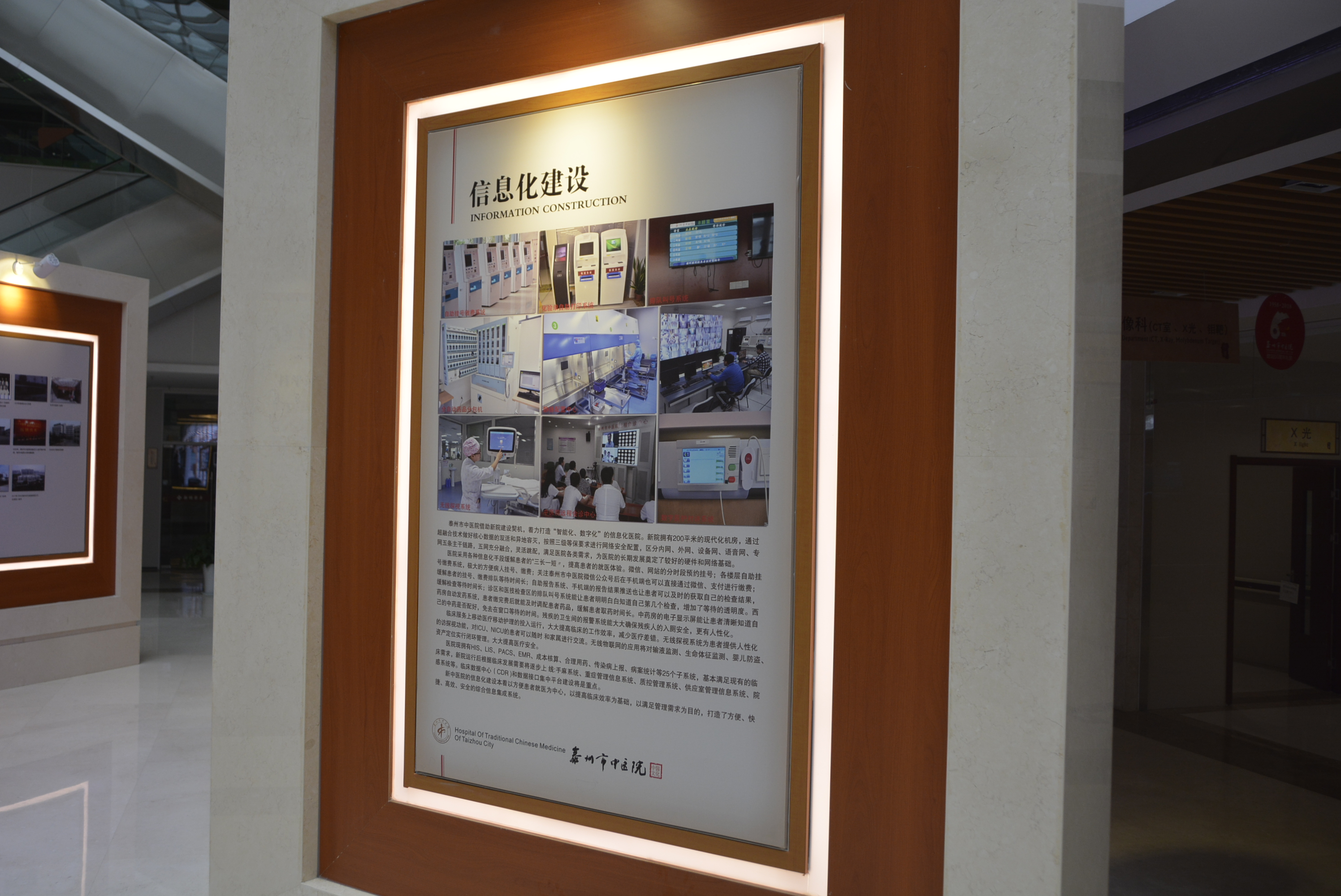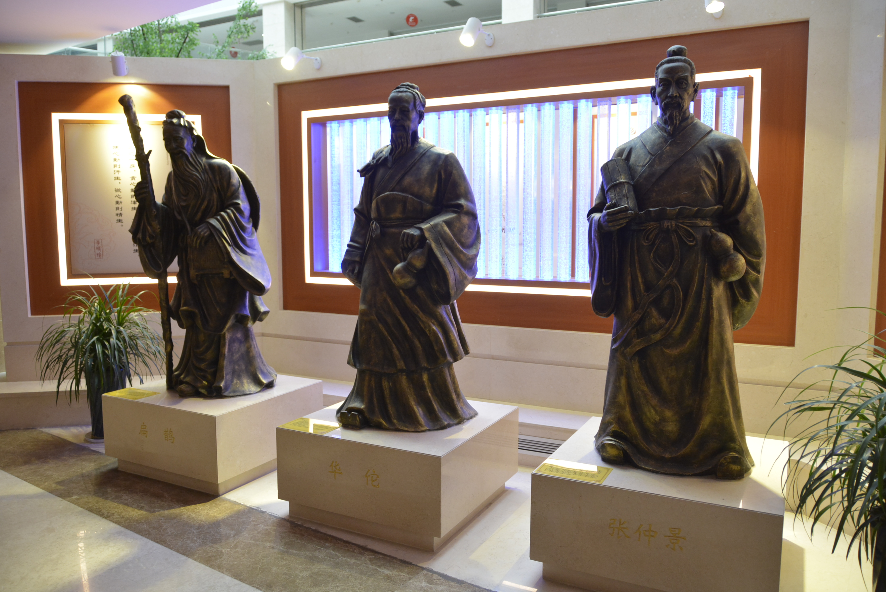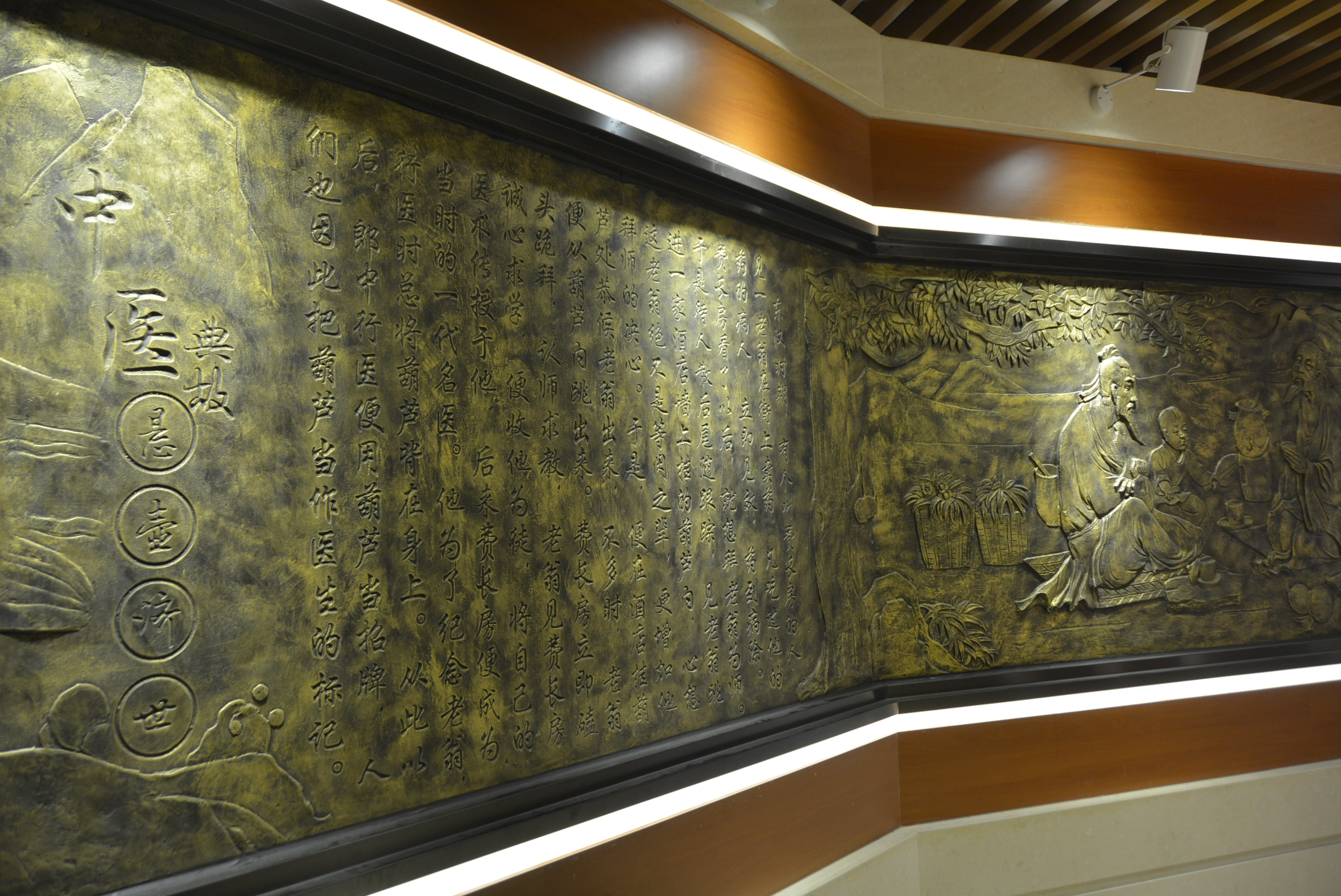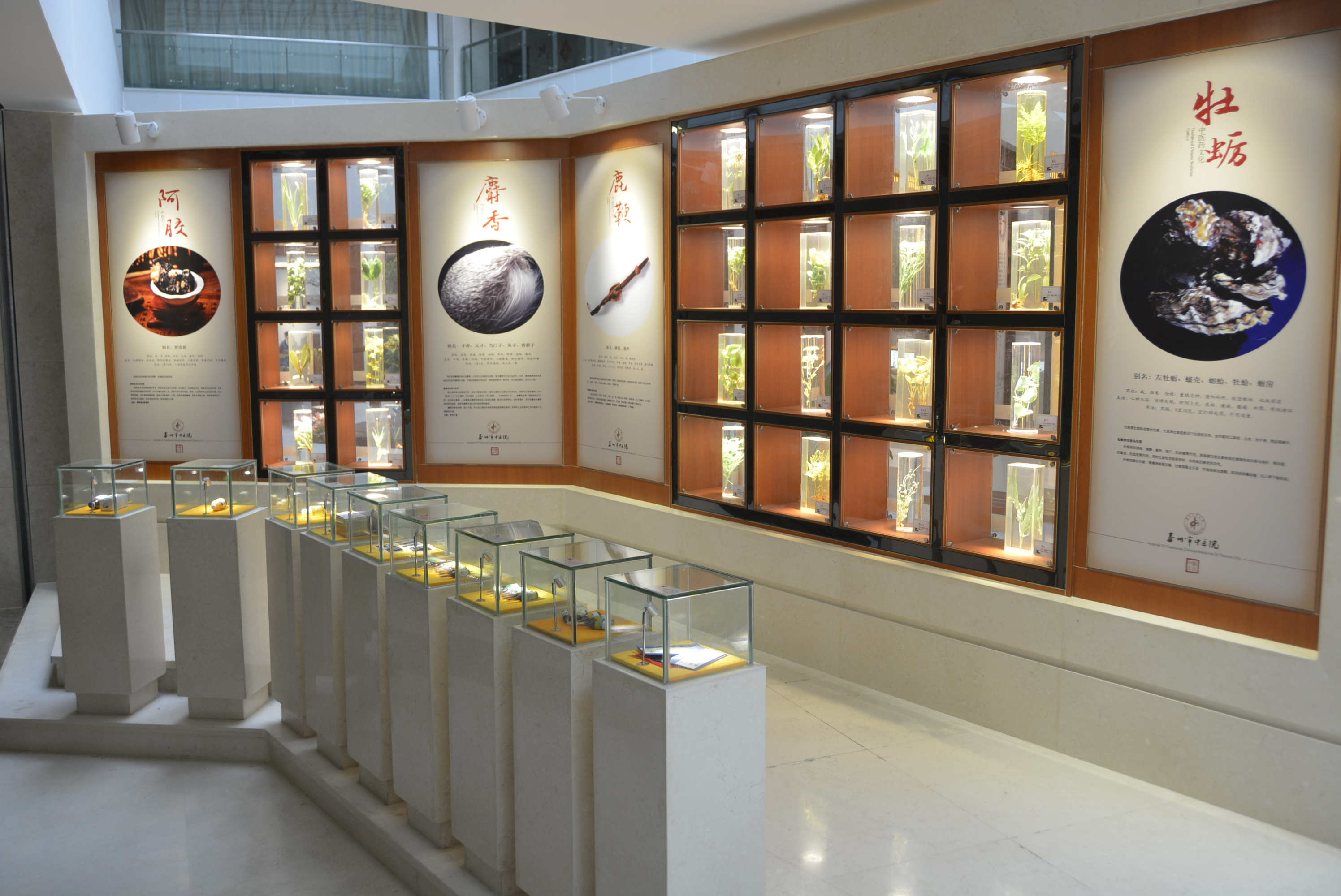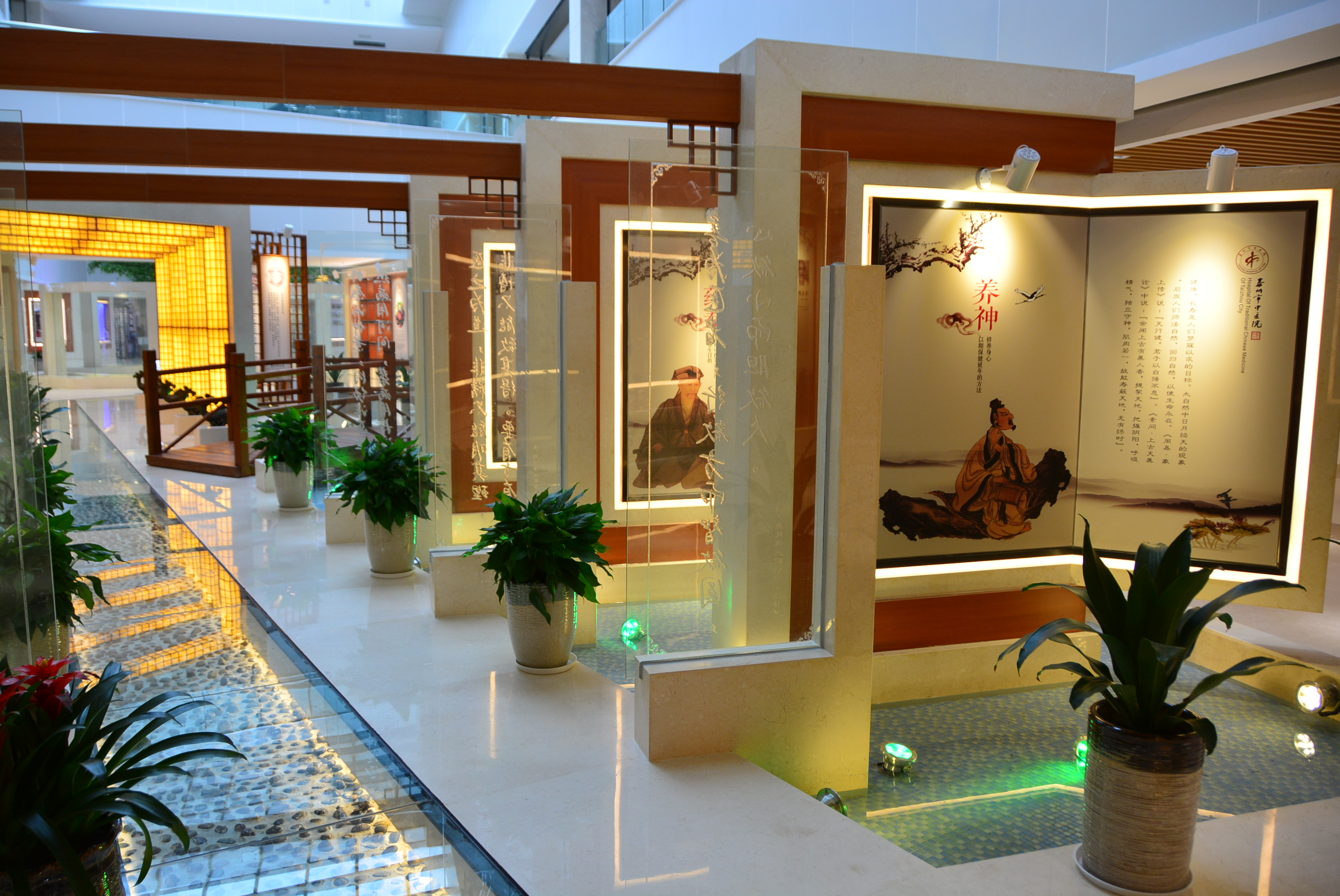 中醫(yī)藥傳統(tǒng)文化展示區(qū)集中展示了中醫(yī)傳統(tǒng)診療技藝,如望聞問切、針灸砭藥,同時設(shè)有中藥材標(biāo)本、中藥飲片、中醫(yī)藥傳統(tǒng)器皿(膏方罐、葫蘆藥瓶、酒瓶、香薰盒等)、中醫(yī)藥古書籍展示區(qū),集中展示標(biāo)本近上百種,還有許多院內(nèi)制劑和養(yǎng)生保健產(chǎn)品,通過實物和文字介紹,可以看到中藥材的藥用部位特性、了解中藥材如何真?zhèn)伪鎰e。中醫(yī)藥養(yǎng)生展示區(qū)集中展示四季養(yǎng)生、八段錦、五禽戲與“六養(yǎng)”即養(yǎng)志、養(yǎng)德、養(yǎng)眼、藥養(yǎng)、養(yǎng)行、養(yǎng)神。中醫(yī)名人典故展示區(qū)集中展示了歷代中醫(yī)藥名醫(yī)、泰州八大名醫(yī),并以浮雕的形式展示了神農(nóng)嘗百草、時珍問藥、扁鵲診脈、雷公炮灸、思邈傳道、仲景著書、懸壺濟(jì)世、橘井泉香等中醫(yī)藥典故。