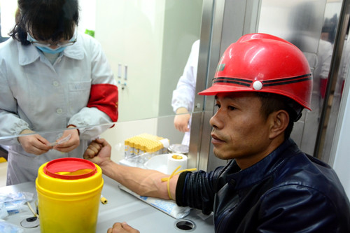 志愿者們?yōu)楣と瞬杉?,抽血化?/span>