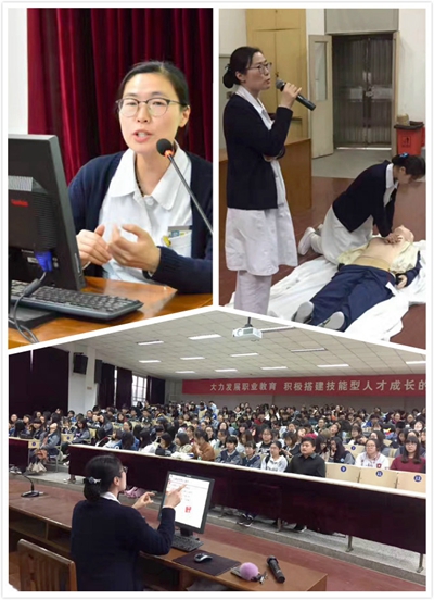 5月8日上午,在我院護理部的精心組織和安排下,急診科急救護理人員來到泰州機電高等職業(yè)學校進行專業(yè)急救技能培訓。參加授課的是我院急診科資深護士邱燕,在模擬的人體上,??谱o士和急救專家動作熟練地示范后,再進行慢動作分解各個操作流程,同時一名??谱o士進行理論知識的配套細節(jié)說明。配套的文字和示范的演示,使同學們直觀、快速學到相應的急救知識和技能。