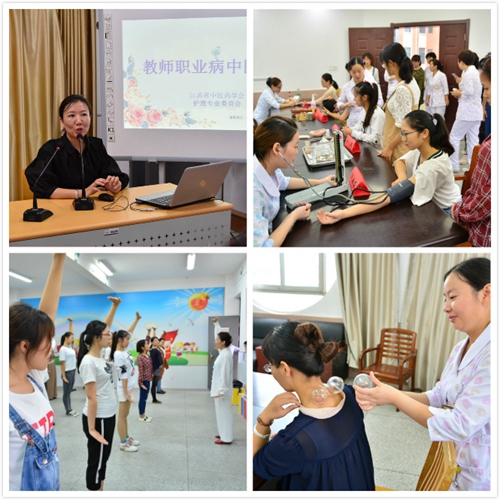第二部分是針對(duì)老師的課堂。在第33個(gè)教師節(jié)來(lái)臨之際,志愿者們特意現(xiàn)場(chǎng)為辛苦工作的園丁們準(zhǔn)備了傳統(tǒng)中醫(yī)藥大餐:由主管護(hù)師周艷講授《教師職業(yè)病的中醫(yī)防護(hù)》,并演示八段錦的功法,隨后按時(shí)間分場(chǎng)地同時(shí)交錯(cuò)進(jìn)行,有測(cè)血壓、測(cè)血糖、中醫(yī)護(hù)理體驗(yàn)刮痧、耳穴貼壓、艾灸、穴位按摩、健康咨詢及健教資料發(fā)放等,教師們按照個(gè)人興趣,積極參與其中,進(jìn)行體驗(yàn),現(xiàn)場(chǎng)教師激情滿滿,極大緩解了教師的工作壓力,促進(jìn)了教師們的身心健康。